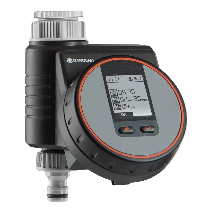 Met de GARDENA besproeiingscomputer Flex kan de irrigatie op balkons, dakterrassen of patio’s flexibel en eenvoudig automatisch worden geregeld. Het apparaat werkt op batterijen, kan direct op de kraan worden aangesloten en kan eenvoudig worden bediend via een innovatieve roterende knop voor de selectie van een programma en het bevestigen ervan. Een gemakkelijk leesbaar display toont alle instellingen in één oogopslag. Het weerbestendige bedieningspaneel kan worden verwijderd. Met de besproeiingscomputer Flex kunnen de besproeiingstijden in cycli van seconden worden aangepast, waardoor ze ideaal zijn voor gebruik met een druppelsysteem. Het is mogelijk om deze waterregeling te combineren met een GARDENA bodemvochtigheidssensor.