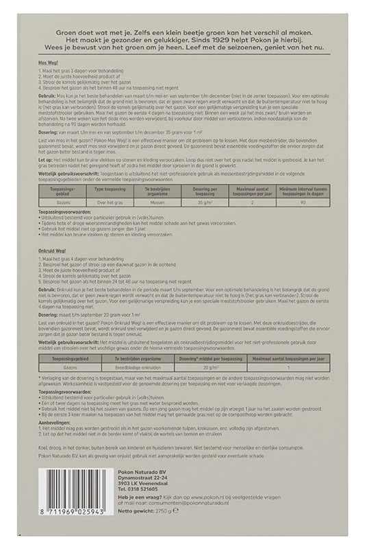 Pokon Mos en Onkruid Weg! is een pakket met zowel een gazonvoeding met onkruidbestrijder als een gazonvoeding met mosbetrijder. Door mos en onkruid verstikt het gras waardoor het gazon wordt verstoord. Pokon Mos Weg! geeft voeding aan het gazon en werkt snel en effectief tegen mossen in gazons. De gazonmest bevat essentiële voedingsstoffen die ervoor zorgen dat het gazon beter bestand is tegen mos. Mos kun je het beste behandelen van maart t/m mei en van september t/m december (niet in de zomer toepassen). Voor een optimale behandeling is het belangrijk dat de grond niet bevroren is, dat er geen zware regen wordt verwacht en dat de buitentemperatuur niet te hoog is (het gras kan verbranden). Maai het gazon de eerste 4 dagen na toepassing niet. Binnen een week zal het mos zwart/bruin worden en afsterven. Na twee weken kan het dode mos worden verwijderd, bij voorkeur door middel van verticuteren. Indien noodzakelijk kan de behandeling na 90 dagen worden herhaald.